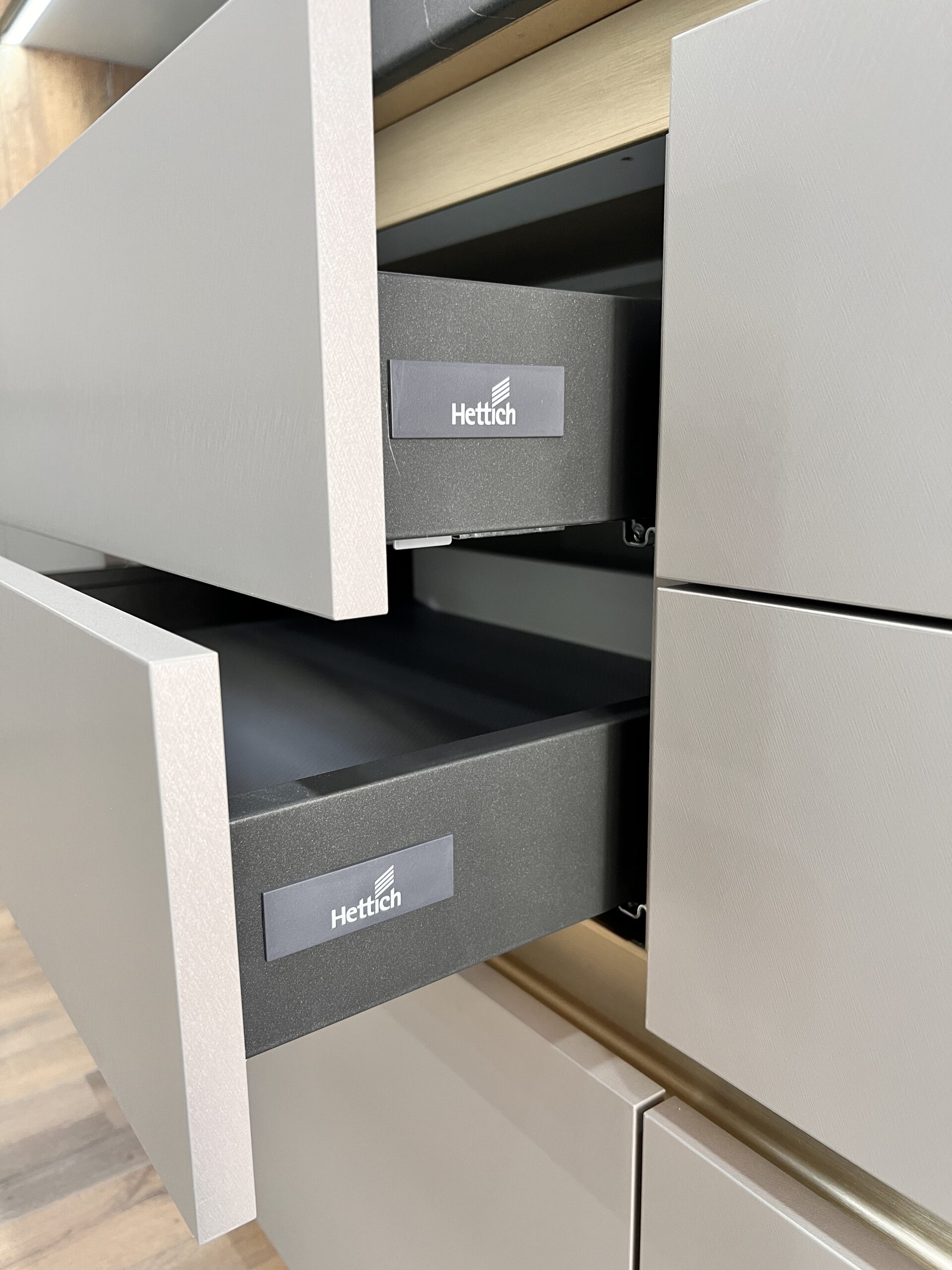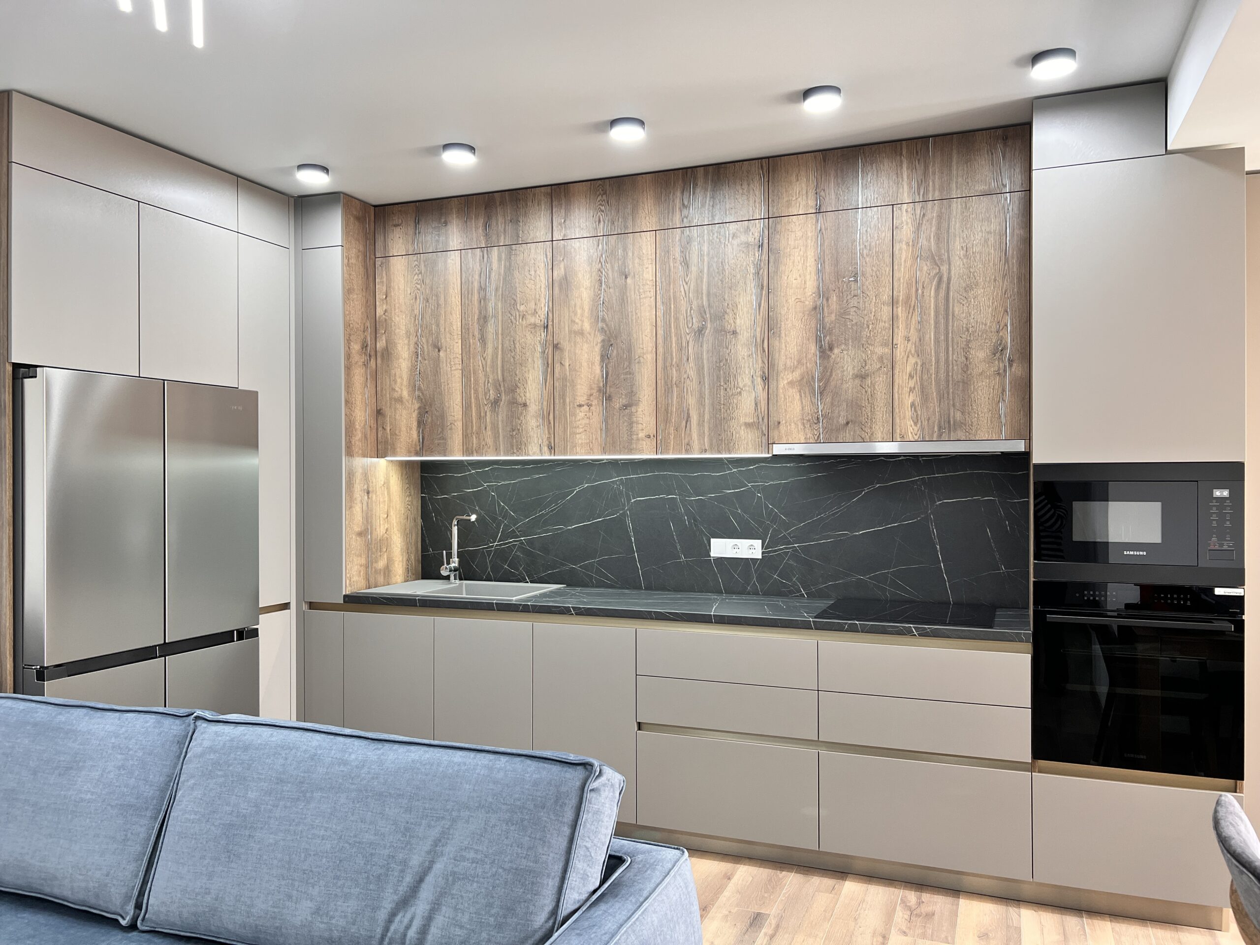 Bucătăria modernă cu vitrină aurie de la Mobo Kitchens & Home este expresia eleganței discrete și a rafinamentului contemporan. Configurația liniară valorifică la maximum spațiul disponibil, oferind un ambient ergonomic și eficient – perfect adaptat stilului de viață modern. Finisajul Gri Cashmere, pus în valoare de fronturile lemnoase, creează o estetică rafinată și echilibrată. Accentele aurii și sticla tonată Bronz din zona vitrinei adaugă un plus de eleganță, fiind ușor de integrat în multiple stiluri de amenajare interioară. Construită din materiale premium de la AGT și Egger, această bucătărie îmbină durabilitatea cu un design actual. Blatul robust și sistemele inteligente de deschidere de la Hettich completează funcționalitatea și confortul în utilizarea de zi cu zi. Este alegerea ideală pentru cei care caută o bucătărie modernă, practică și elegantă.