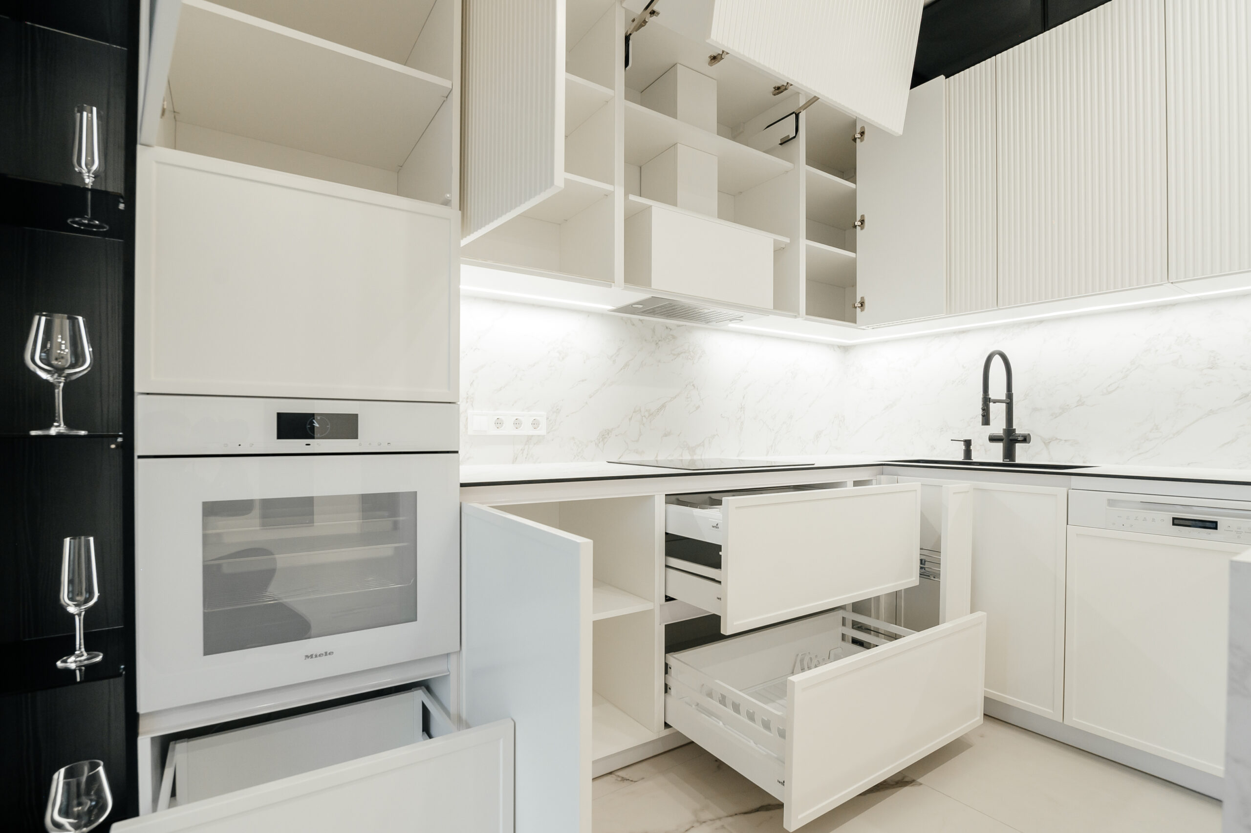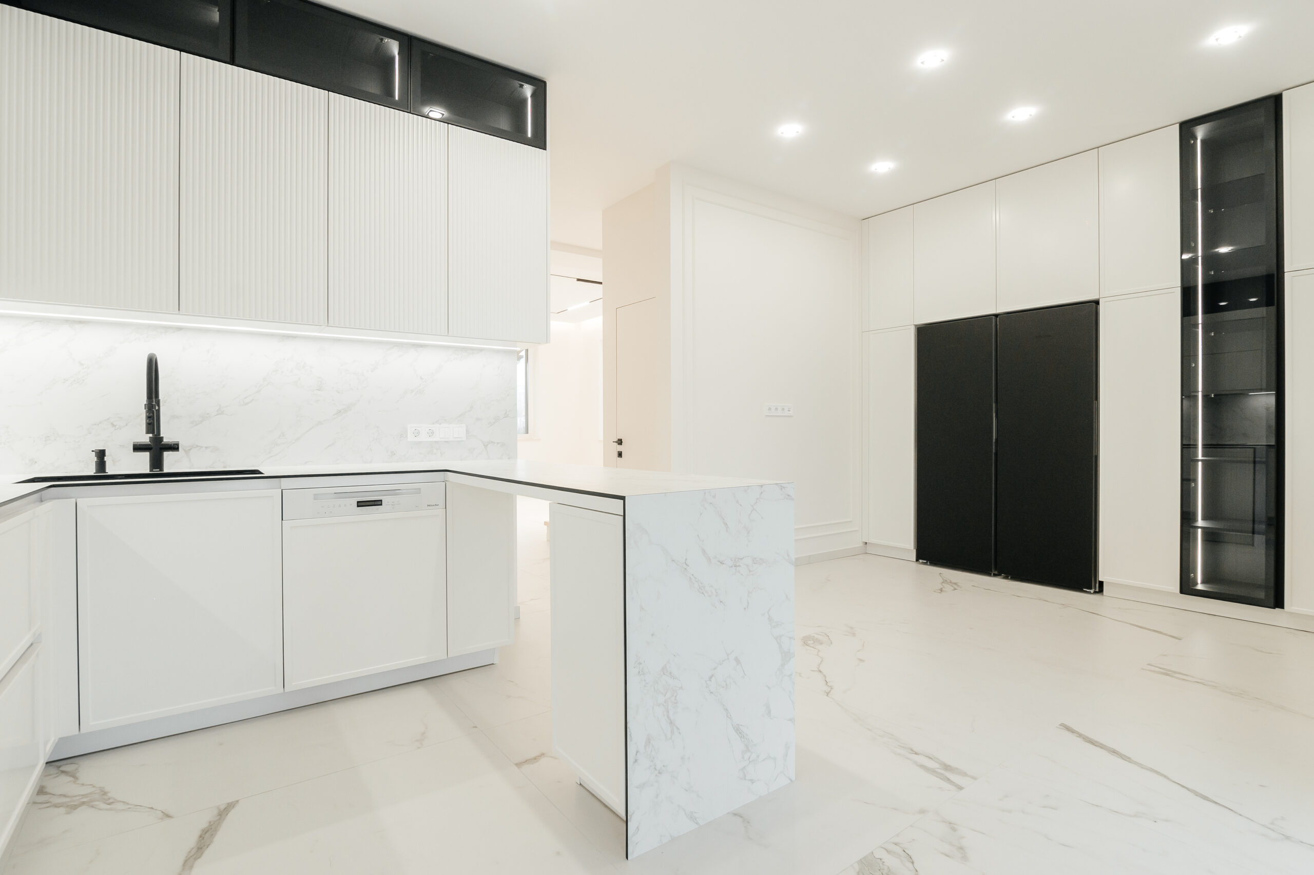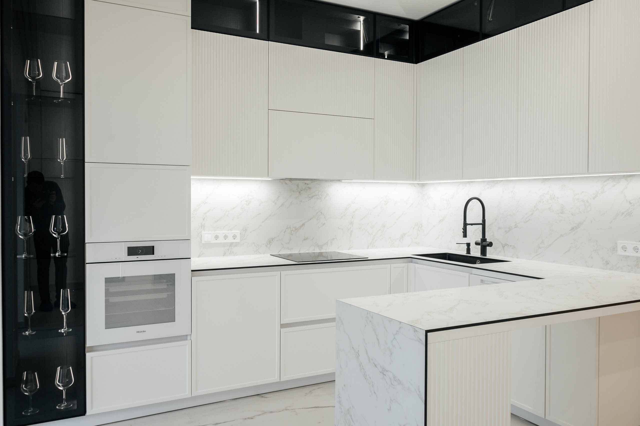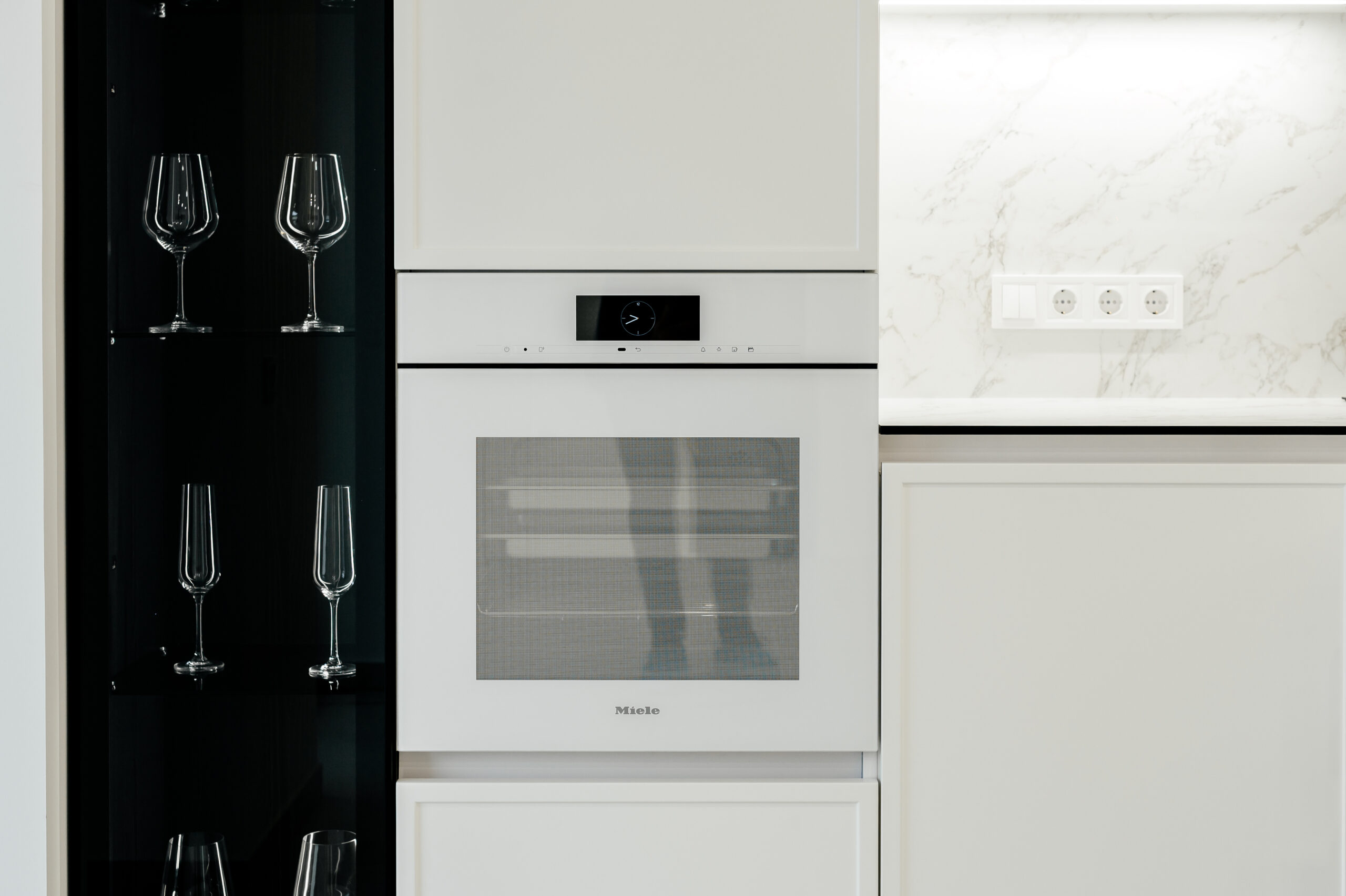 Bucătăria neoclasică cu insulă de la Mobo Kitchens & Home reinterpretează eleganța clasică printr-un design actual, combinând fronturile din MDF vopsit cu riflajul decorativ Monaco. Proiectată funcțional, este împărțită în două zone distincte: zona de gătit și cea de depozitare, unite vizual de un element contrastant – vitrina cu sticlă tonată, prezentă în ambele segmente. Bucătăria este realizată din materiale premium: MDF vopsit pentru fronturi, Egger pentru carcase, iar blatul și contrablatul din HPL Compact, recunoscut pentru rezistența sa. Dulapurile încăpătoare sunt prevăzute cu organizatoare și sisteme de închidere lină de la Hettich, pentru un plus de confort. Paleta albă contribuie la un ambient luminos și primitor. Este alegerea perfectă pentru cei care își doresc un spațiu personalizat, funcțional și cu un rafinament atemporal.