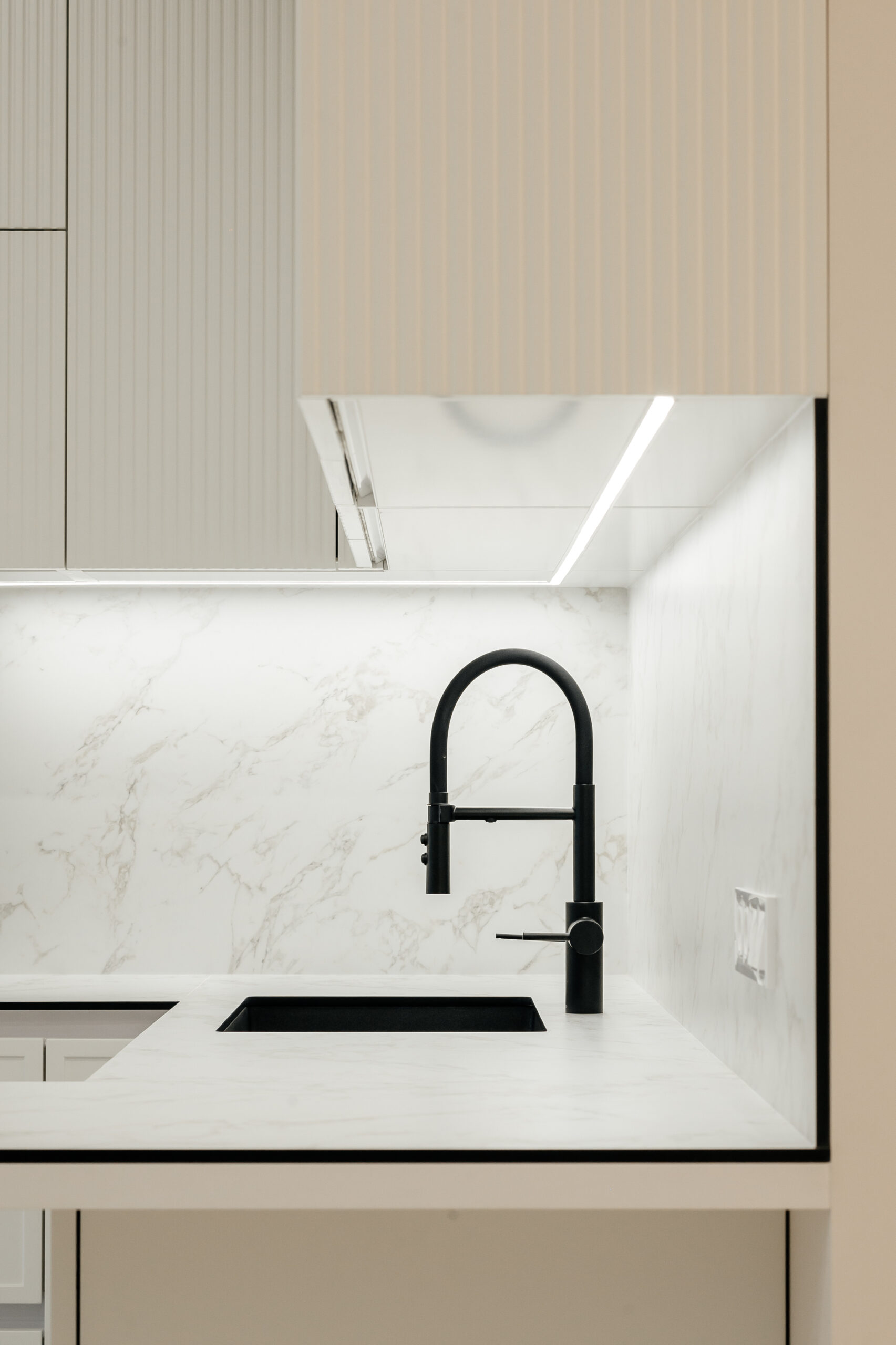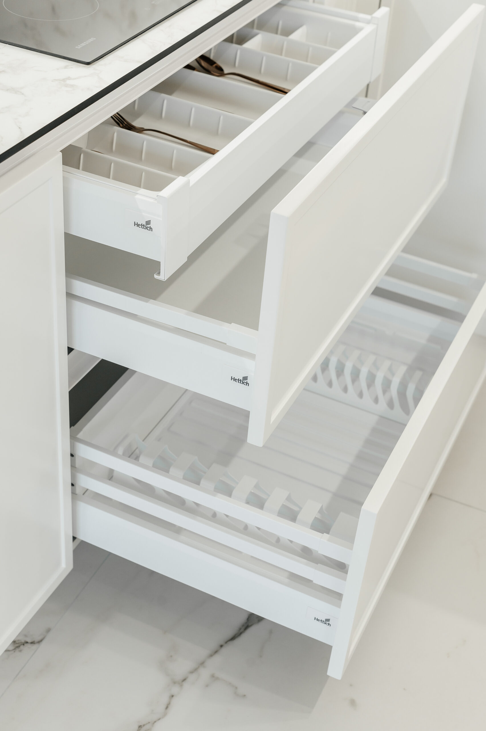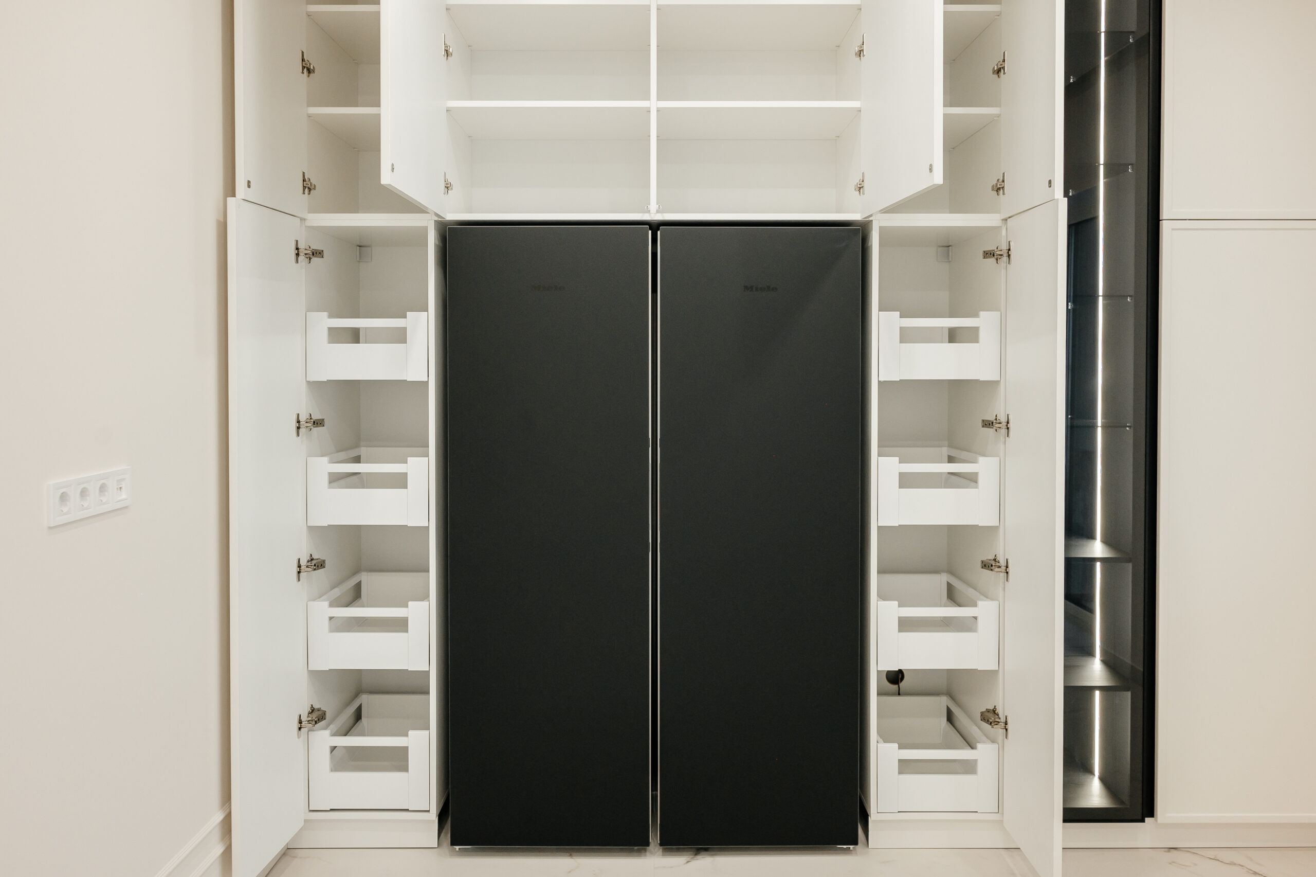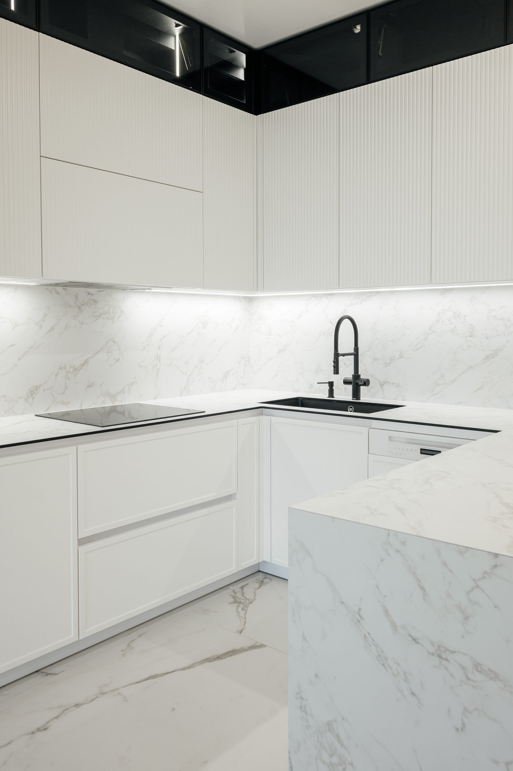 Bucătăria neoclasică cu insulă de la Mobo Kitchens & Home reinterpretează eleganța clasică printr-un design actual, combinând fronturile din MDF vopsit cu riflajul decorativ Monaco. Proiectată funcțional, este împărțită în două zone distincte: zona de gătit și cea de depozitare, unite vizual de un element contrastant – vitrina cu sticlă tonată, prezentă în ambele segmente. Bucătăria este realizată din materiale premium: MDF vopsit pentru fronturi, Egger pentru carcase, iar blatul și contrablatul din HPL Compact, recunoscut pentru rezistența sa. Dulapurile încăpătoare sunt prevăzute cu organizatoare și sisteme de închidere lină de la Hettich, pentru un plus de confort. Paleta albă contribuie la un ambient luminos și primitor. Este alegerea perfectă pentru cei care își doresc un spațiu personalizat, funcțional și cu un rafinament atemporal.